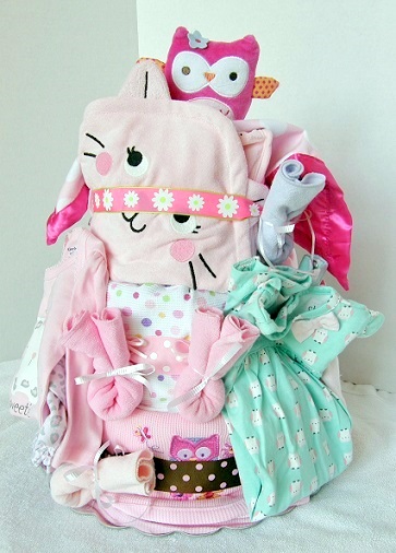 Check out this adorable baby girl diaper cake that uses the nursery rhyme The Owl and The Pussycat to create it's theme.